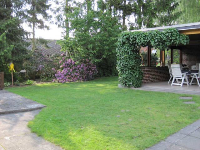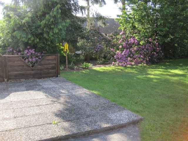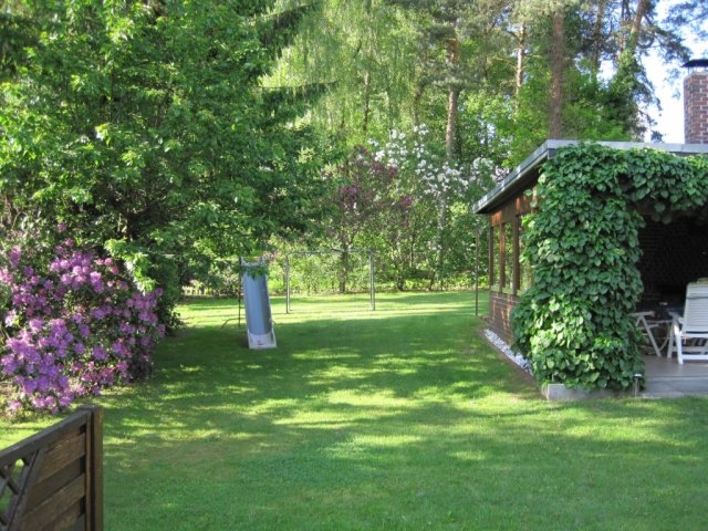 Die Außenanlage bietet einen großzügigen Garten zur Alleinnutzung. Für die Kinder stehen eine Schaukel mit Rutsche und verschiedene Fahrzeuge bereit.
