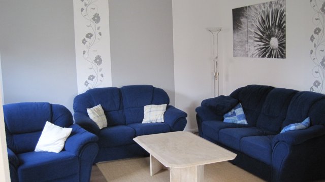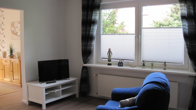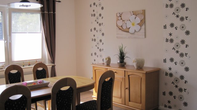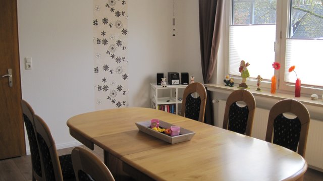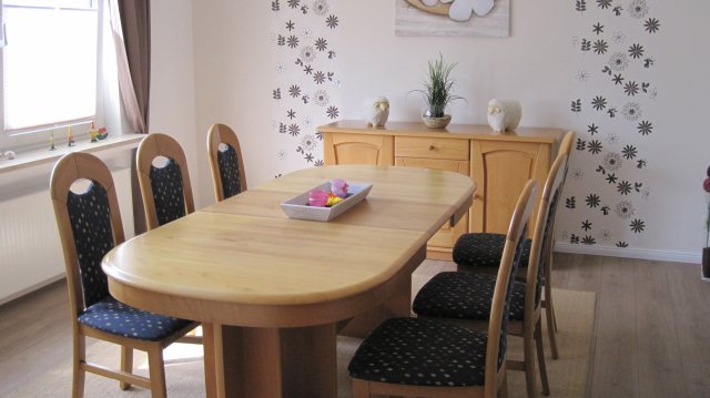 Das geräumige Wohnzimmer ist mit SAT-TV und Radio ausgestattet. Der Esszimmertisch bietet ausreichend Platz für alle Gäste, um gemeinsam zu frühstücken und zu essen. Für die kleinen Gäste steht ein Hochstuhl bereit.